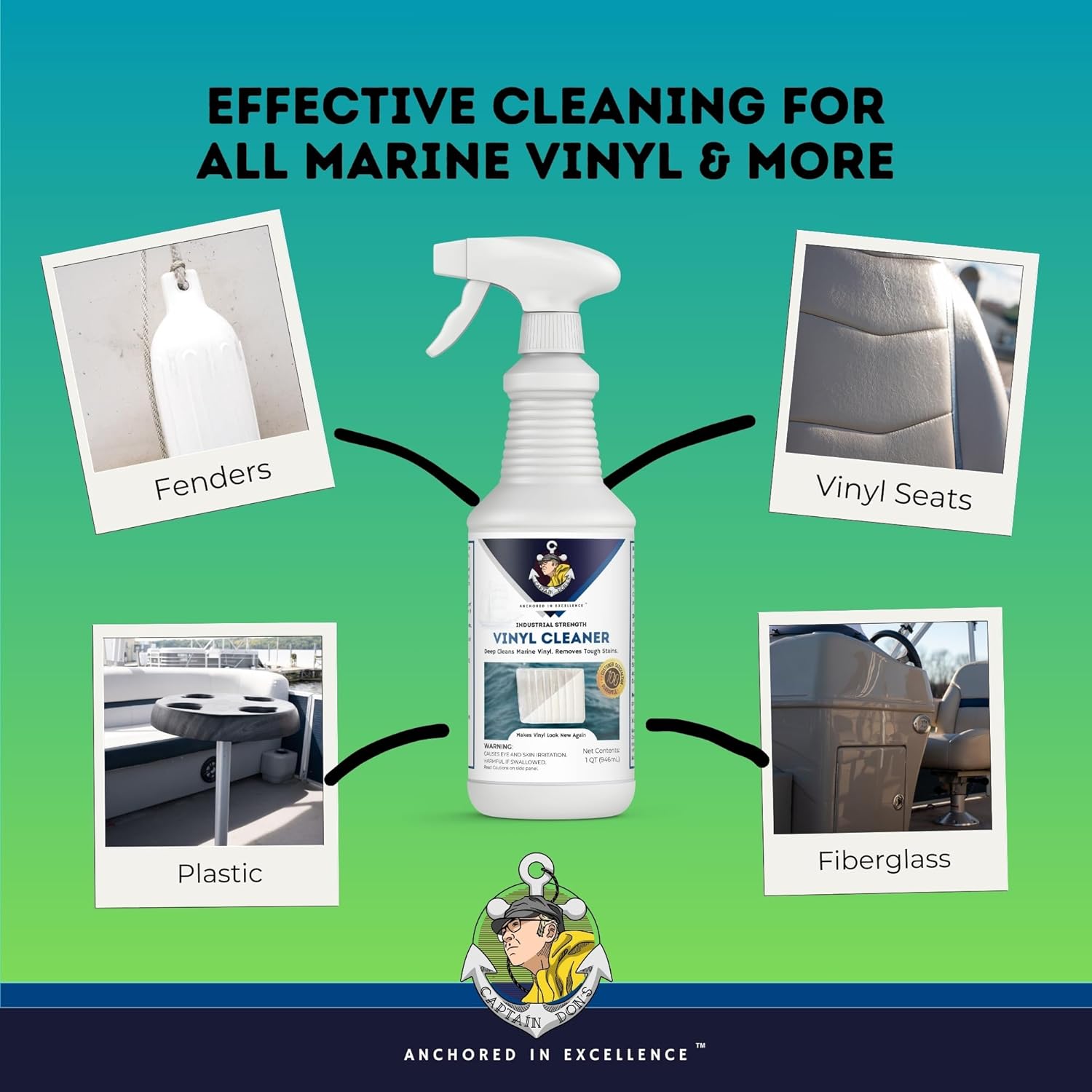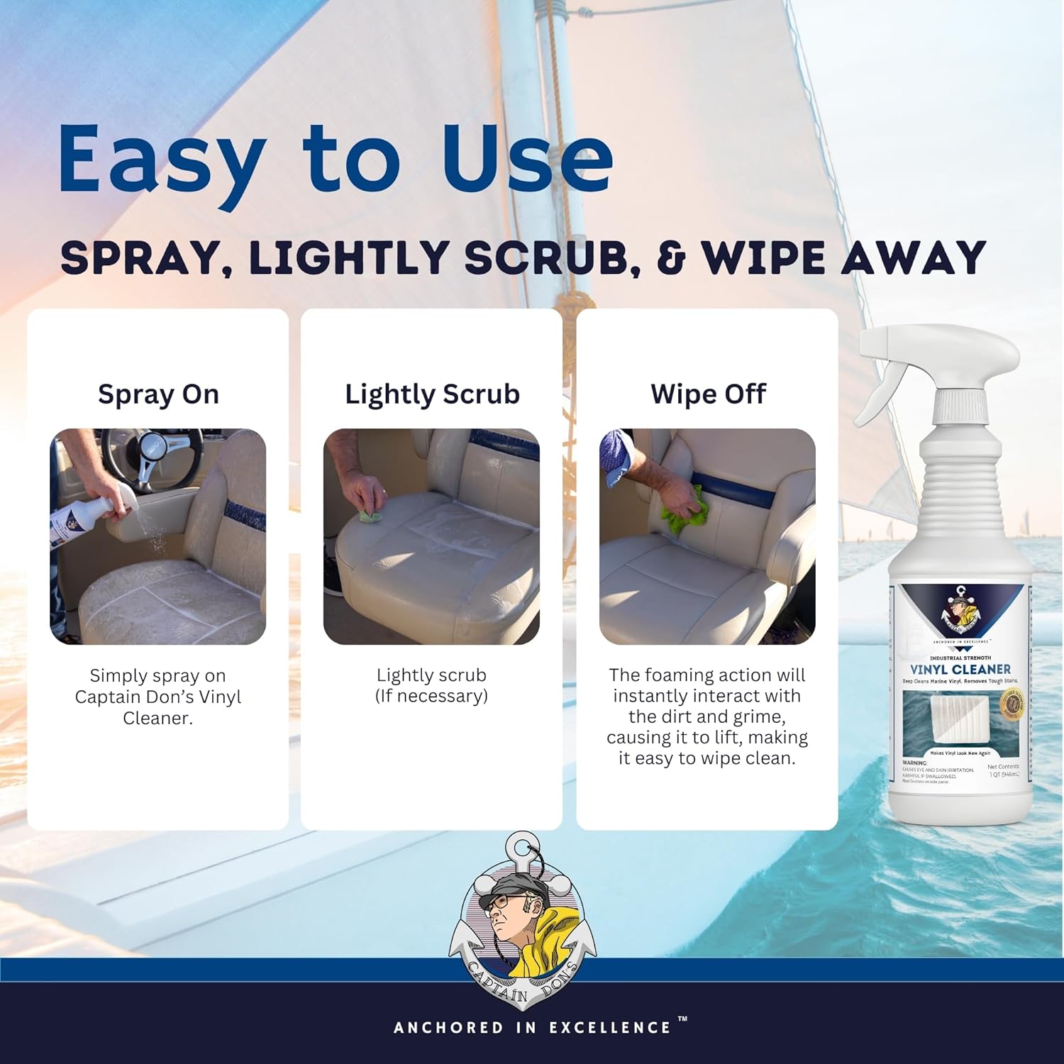 - Easy Application - Simply spray, scrub if necessary, and wipe clean. Captain Don's makes boat cleaning a breeze, perfect for anyone needing an effective vinyl boat seat cleaner.