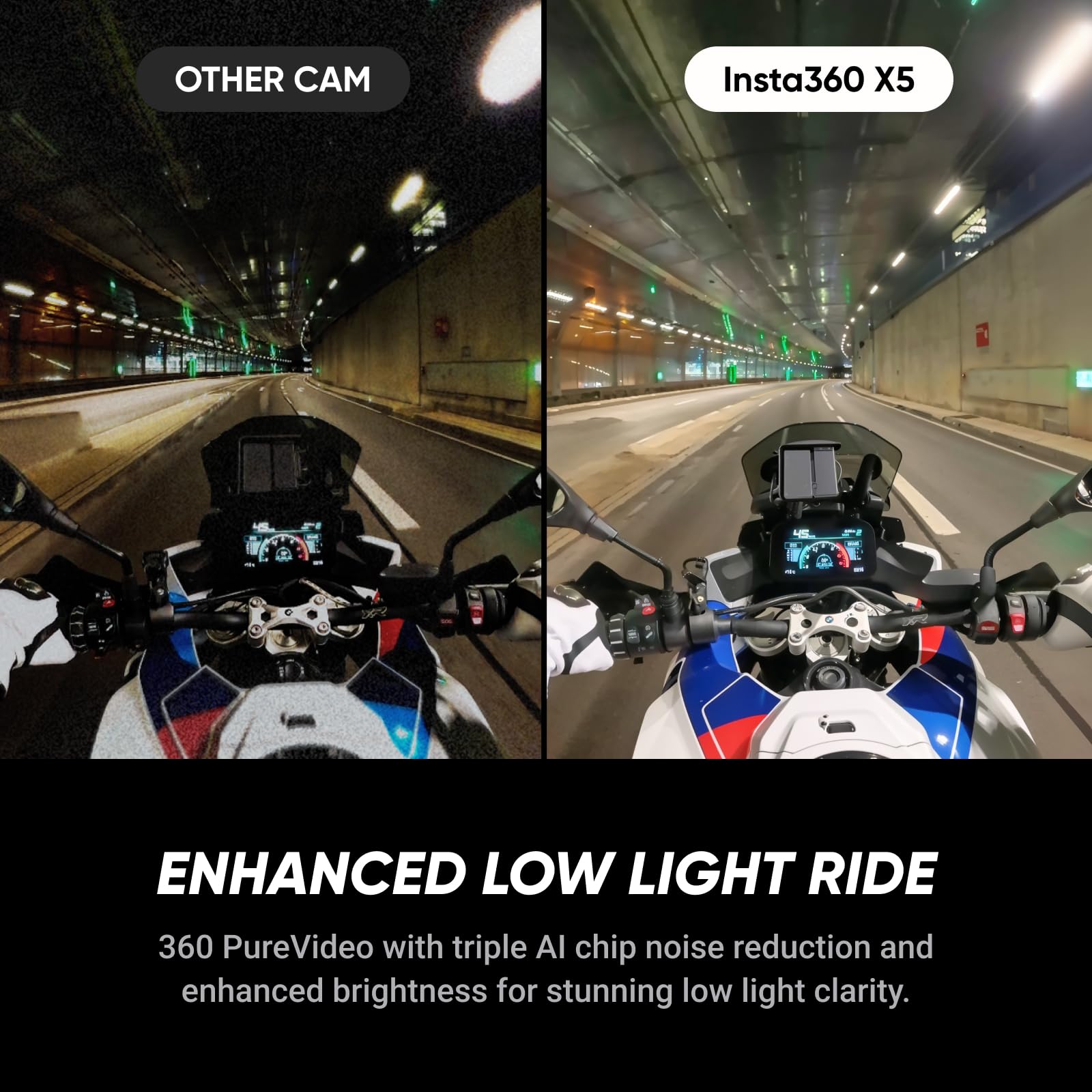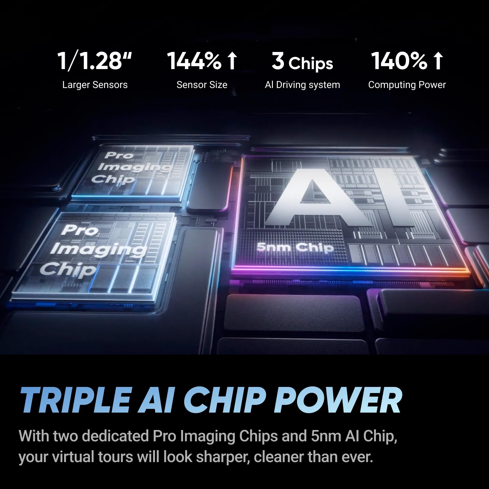 - Triple AI Chip Design, Better Low Light: Shoot confidently even in challenging lighting. X5’s triple AI chip design powers advanced noise reduction and image processing, delivering crisp, vibrant footage even in dim or night conditions.