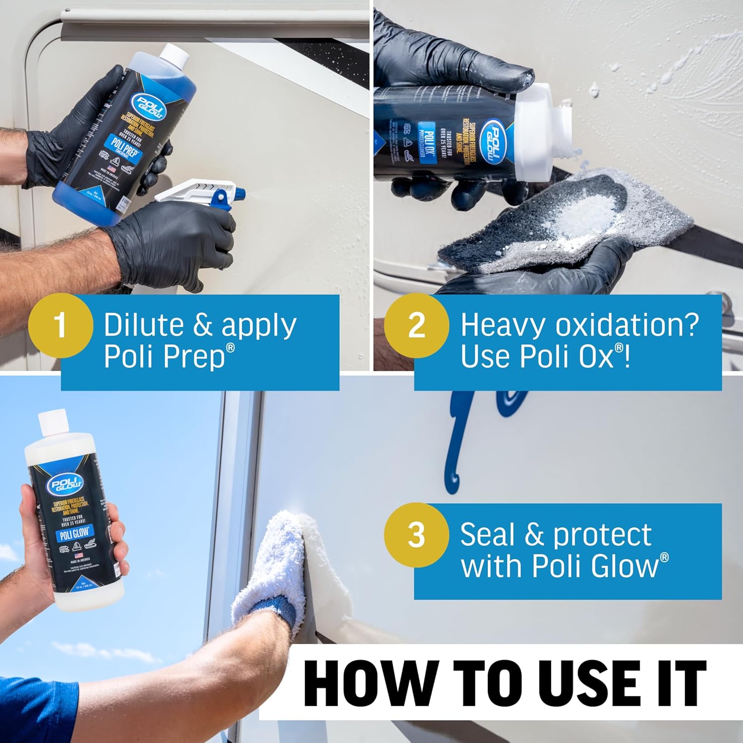 - OLD BOAT? NEW TRICKS! - Poli Glow boat cleaning supplies are like a time machine for your vessel. Whether your cruiser’s still got that new-boat aroma or it's old enough to order its own drinks, this Poli Glow RV kit has the magic touch to bring back that factory shine. EACH DELUXE KIT INCLUDES: (1) 32-ounce bottle of Poli Glow, (1) 32-ounce bottle of Poli Prep, (1) mitt applicator, white scrub pad with handle & gloves, (1) 20-ounce bottle of Poli Ox, and (2) ultra-fine scrub pads.