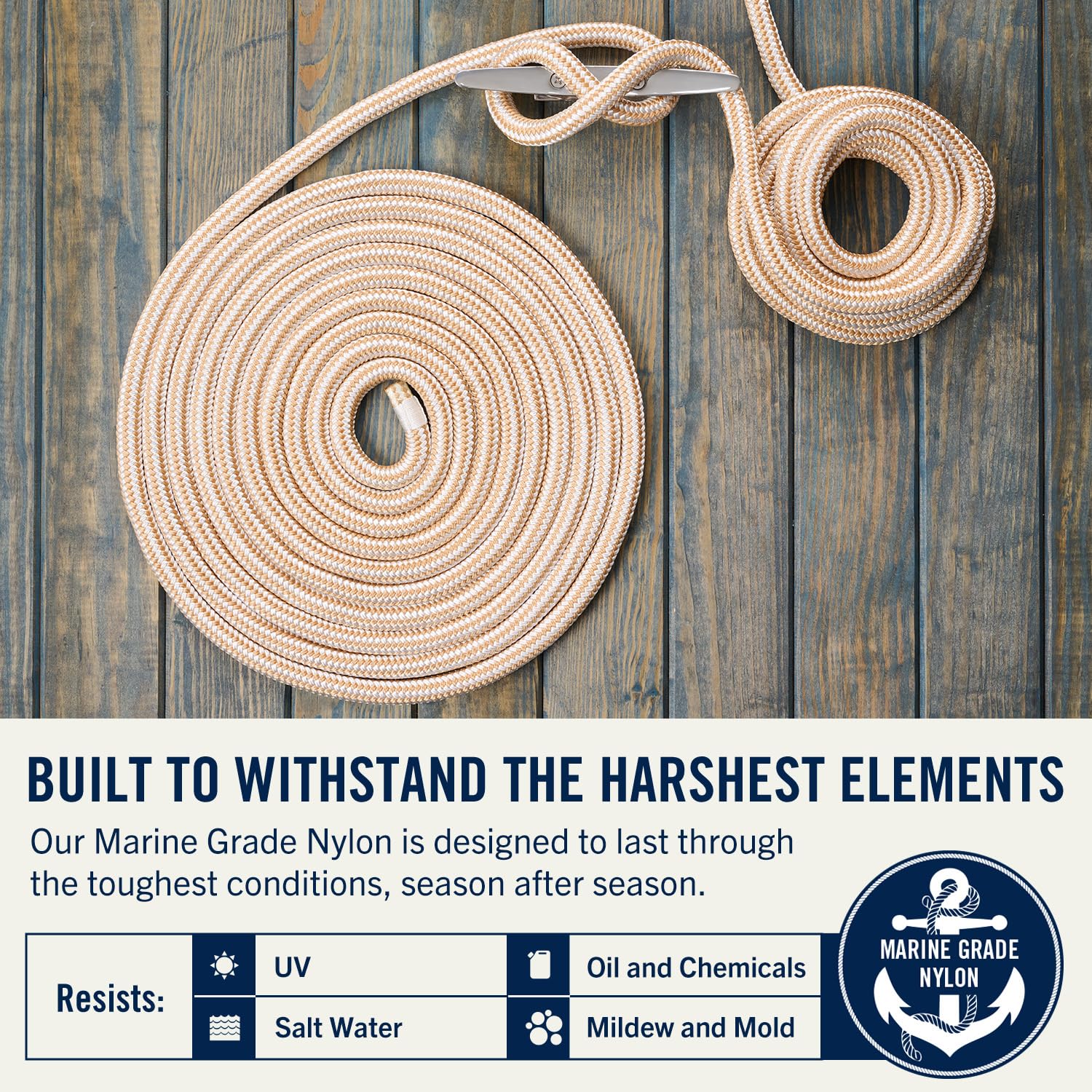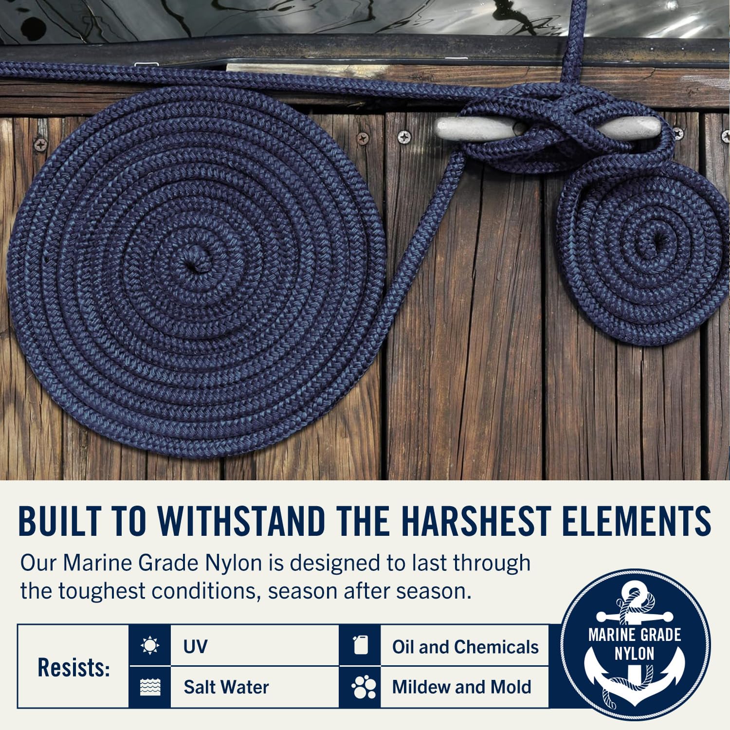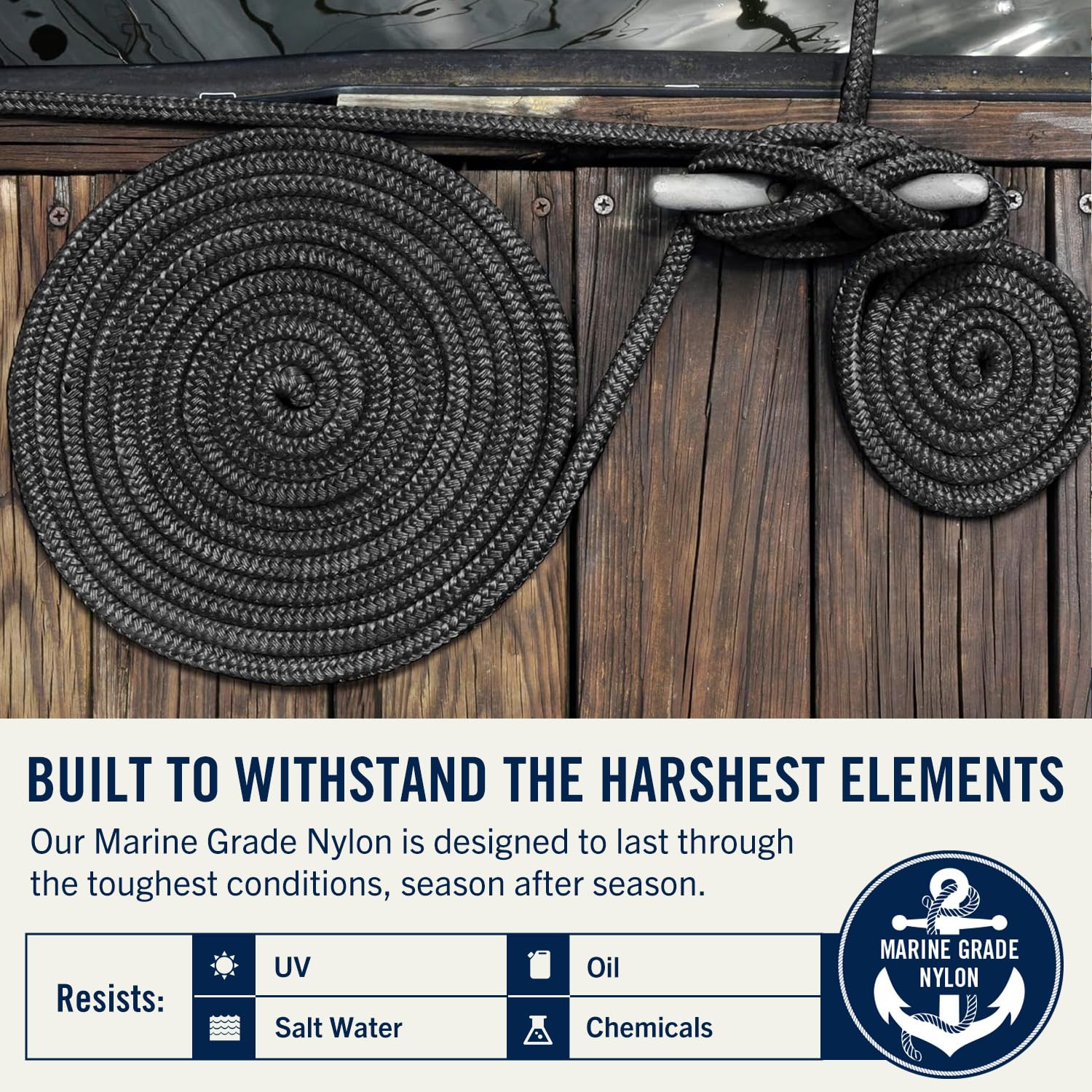 - Strong & Shock-Absorbent: Our double-braided nylon boat lines for docking are ultra strong, with a higher tensile strength than other materials. By design, these boat dock lines & rope allow for controlled stretch and increased shock absorption. Each one stands up against saltwater, sun, storms, oil, and rot for a long life!
